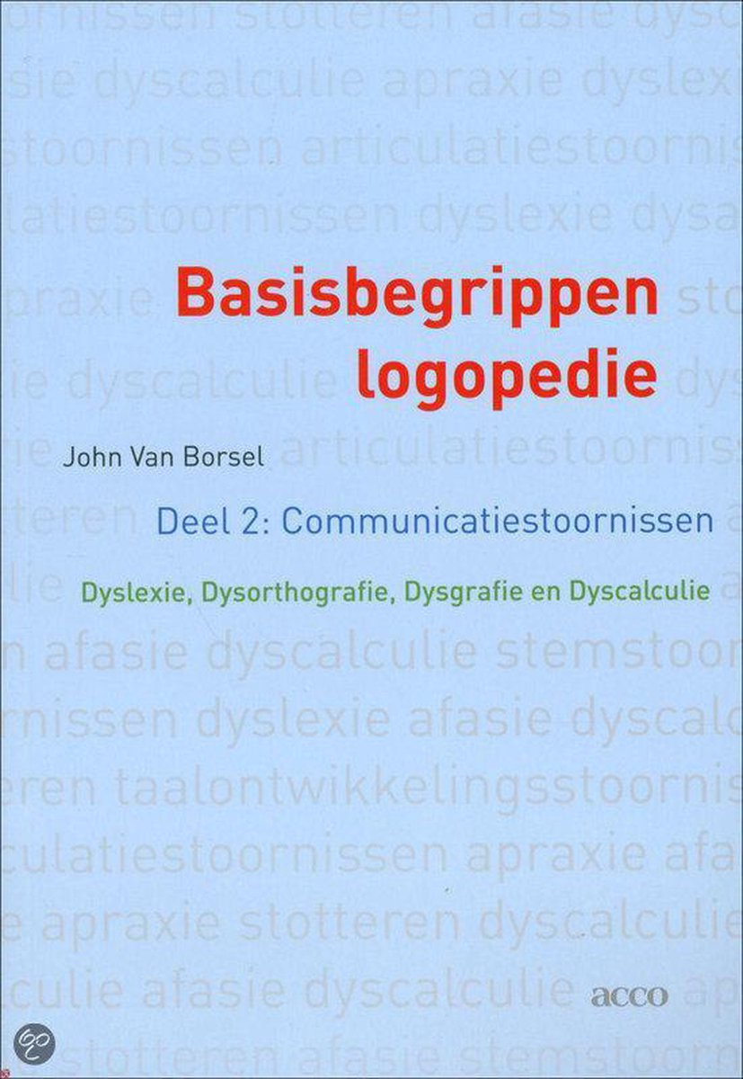 De meest gevonden boeken zijn Basisbegrippen Logopedie Deel 2: Communicatiestoornissen, Basisbegrippen Logopedie 2 Communicatiestoornissen. Articulatiestoornissen, Basisbegrippen Logopedie Deel 2: Communicatiestoornissen Afasie, Dysartrie, Apraxie En Andere Neurogene Communicatiestoornissen, Basisbegrippen Logopedie 2 Communicatiestoornissen: Tests En Testgebruik en Basisbegrippen Logopedie Communicatiestoornissen Dyslexie, Dysorthografie, Dysgrafie En Dyscalculie.
