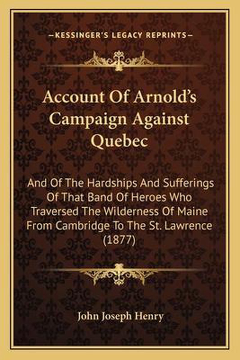 De meest gevonden boeken zijn Account Of Arnold's Campaign Against Quebec, An Accurate And Interesting Account Of The Hardships And Sufferings Of That Ba, Account Of Arnold's Campaign Against Quebec, And Of The Hardships And Sufferings Of That Band Of Heroes Who Traversed The Wilderness Of Maine From Cambridge To The St. Lawrence, In The Autumn Of 1775, A Rifleman With Morgan en Account Of Arnold's Campaign Against Quebec, And Of The Hardships And Sufferings Of That Band Of Heroes Who Traversed The Wilderness Of Maine From Cambridge To The St. Lawrence (1877).