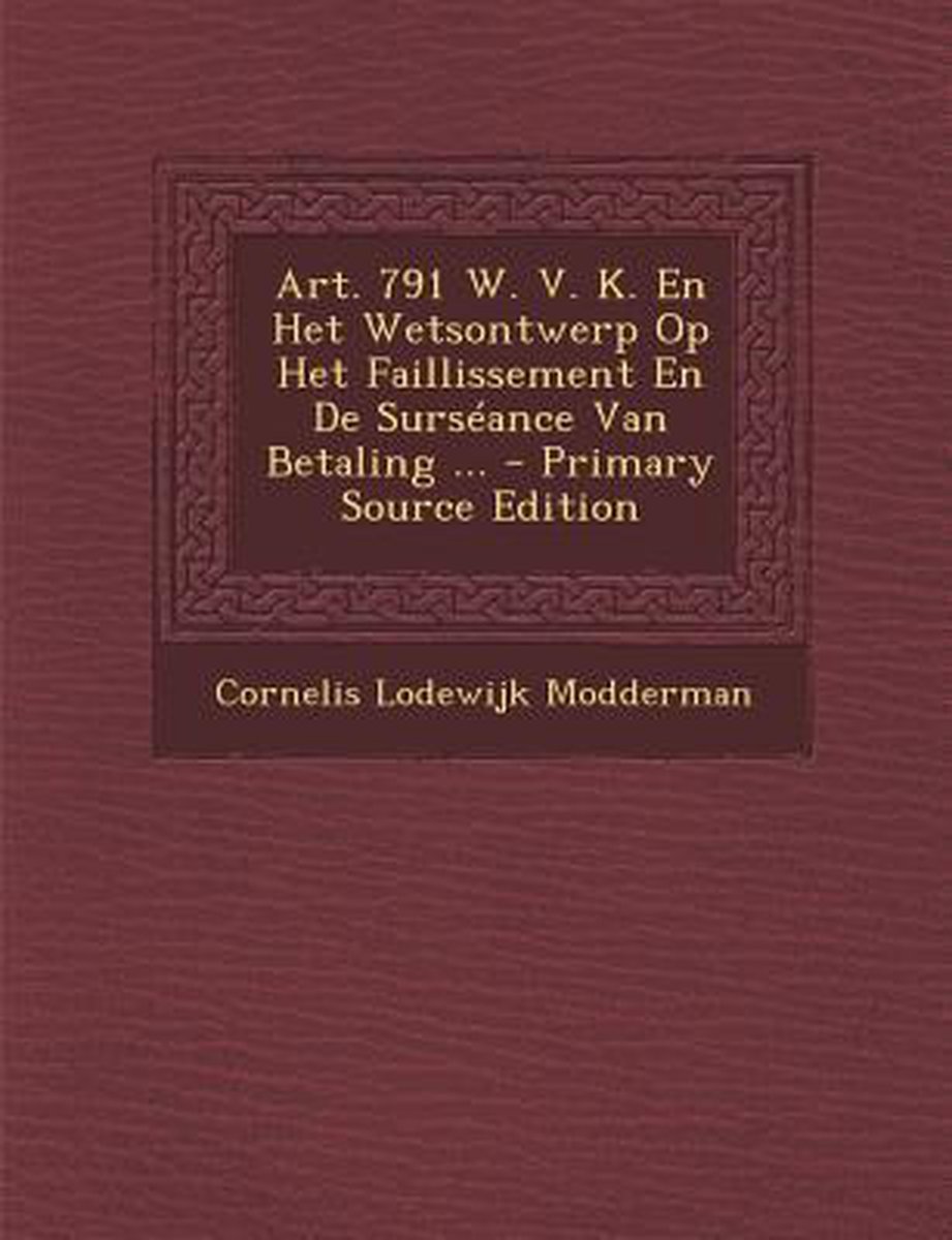 De meest gevonden boeken zijn Art. 791 W. V. K. En Het Wetsontwerp Op Het Faillissement En De Surseance Van Betaling (1892) en Art. 791 W. V. K. En Het Wetsontwerp Op Het Faillissement En De Surseance Van Betaling ... - Primary Source Edition.