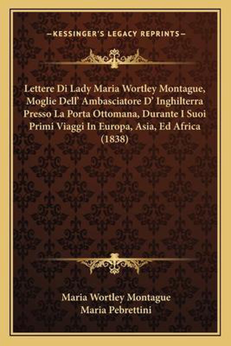 Het enige gevonden boek is Lettere Di Lady Maria Wortley Montague, Moglie Dell' Ambasciatore D' Inghilterra Presso La Porta Ottomana, Durante I Suoi Primi Viaggi In Europa, Asia, Ed Africa (1838).
