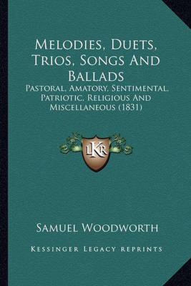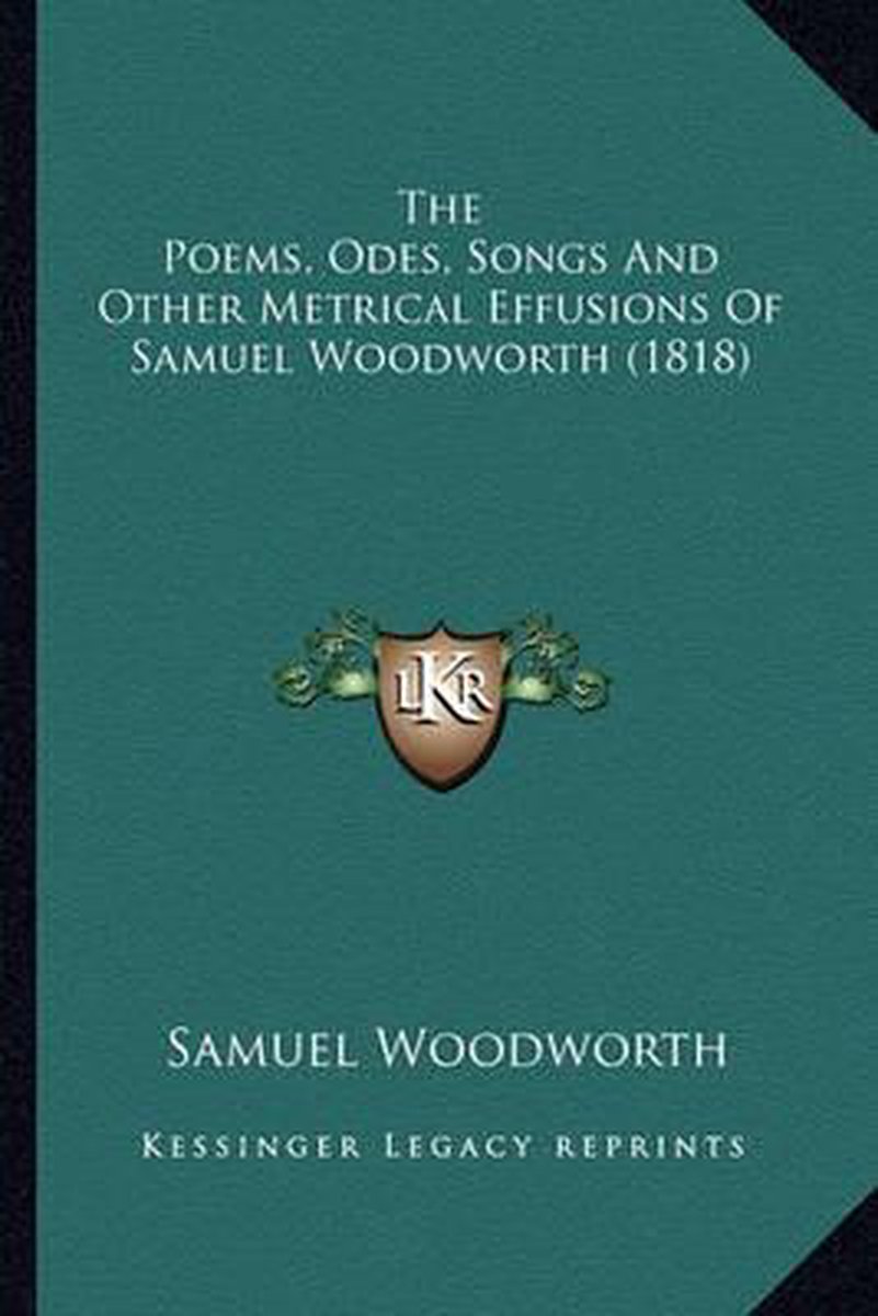 De meest gevonden boeken zijn Melodies, Duets, Trios, Songs, And Ballads, Pastoral, Amatory, Sentimental, Patriotic, Religious, And Miscellaneous. Together With Metrical Epistles, Tales And Recitations, The Poems, Odes, Songs, And Other Metrical Effusions, Of Samuel Woodworth, Champions Of Freedom, Melodies, Duets, Trios, Songs, And Ballads, Pastoral, Amatory, Sentimental, Patriotic, Religious, And Miscellaneous. Together With Metrical Epistles, Tales And Recitations. By Samuel Woodworth. en The Poems, Odes, Songs And Other Metrical Effusions Of Samuel Woodworth (1818).